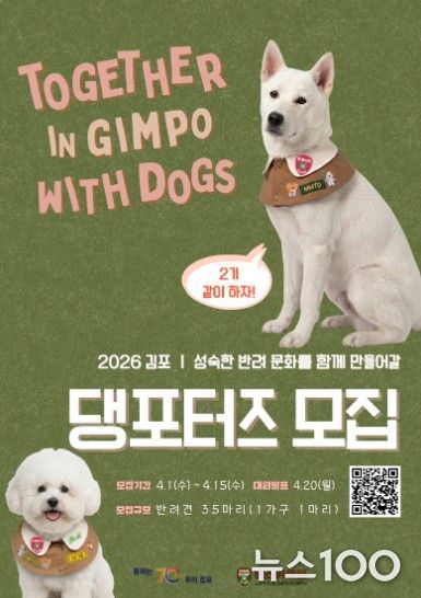 뉴스100 김동초 기자 | 김포시는 올바르고 책임 있는 반려문화 확산을 이끌 ‘김포 댕포터즈’를 모집한다고 밝혔다.