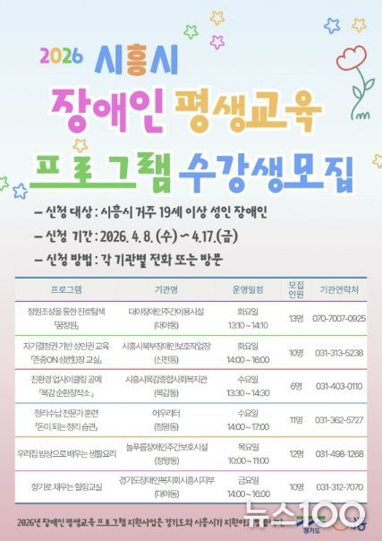 뉴스100 김동초 기자 | 시흥시가 관내 성인 장애인의 학습권 보장과 사회참여 확대를 위해 ‘2026년 장애인 평생교육 프로그램 지원사업’을 본격적으로 시작하며, 4월 8일부터 17일까지 프로그램 운영을 위한 학습자를 모집한다.