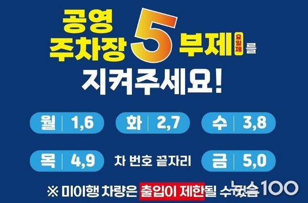 5부제 대상 차량은 차량번호 끝자리 숫자를 기준으로 월요일 1ܬ번 화요일 2ܭ번 수요일 3ܮ번 목요일 4ܯ번 금요일 5ܦ번이며, 5부제 의무 시행 주차장의 경우 5부제 대상 차량은 해당일에 입차가 제한될 예정이다. 다만, 장애인 차량·임산부·미취학 유아동승 차량, 전기·수소차량 등은 예외 대상으로 운영할 예정이다.