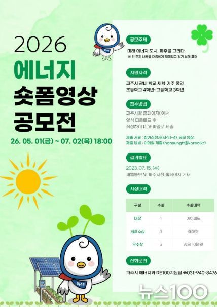 뉴스100 김동초 기자 | 파주시는 청소년들의 에너지 인식을 제고하고 디지털 미디어 활용 역량을 강화하기 위해 녪년 파주시 청소년 에너지 숏폼 영상 공모전’을 개최한다.