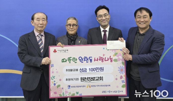뉴스100 김동초 기자 | 수원시 영통구 원천동은 지난 10일 원천장로교회가 지역 내 저소득 주민들을 돕기 위해 성금 100만 원을 행정복지센터에 기탁했다고 밝혔다.