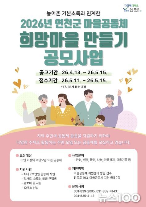 뉴스100 김동초 기자 | 연천군 마을공동체지원센터가 농어촌기본소득과 연계한 ‘2026년 희망마을 만들기 주민공모사업’ 참여 공동체를 모집한다.