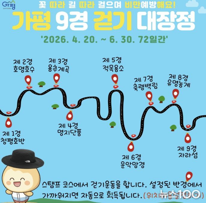 뉴스100 김동초 기자 | 가평군의 수려한 자연경관을 배경으로 건강을 다지는 ‘2026 가평 9경 걷기 대장정’이 오는 20일부터 시작된다. 가평군보건소는 군민들의 비만을 예방하고 걷기 실천율을 높이기 위해 이번 프로그램을 마련했다고 15일 밝혔다.