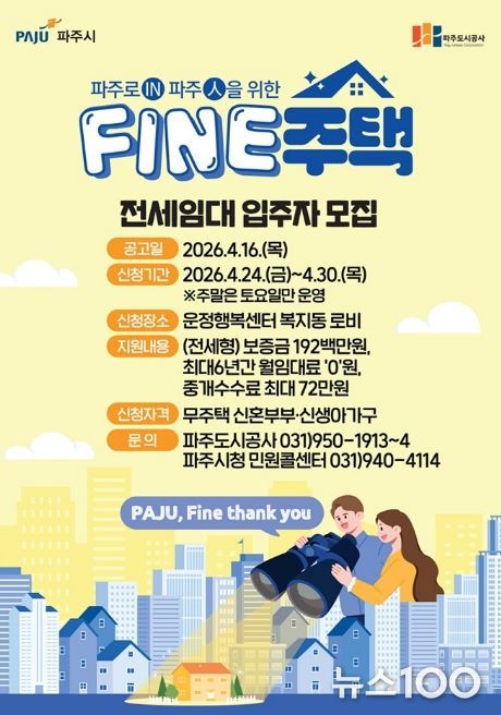 뉴스100 김동초 기자 | 파주시는 신혼부부와 신생아 가구의 주거비 부담을 완화하기 위한 ‘파인(FINE)주택’전세임대사업 입주자를 모집한다.