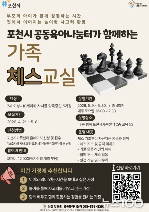 뉴스100 김동초 기자 | 포천시 더 큰 행복 포천시가족센터는 공동육아나눔터 상시 프로그램의 일환으로 아동의 논리적 사고력 향상과 부모-자녀 간 긍정적 상호작용을 지원하기 위해 가족 참여형 체스 프로그램 '가족 체스 교실'을 운영한다고 밝혔다.