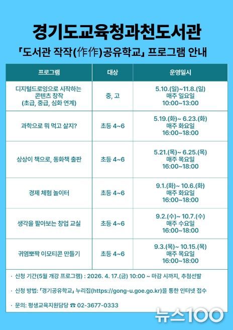 뉴스100 김동초 기자 | 경기도교육청과천도서관이 학생들의 자기주도 학습 역량과 창의적 사고력 함양을 위해 ‘도서관 작작(作作) 공유학교’를 운영한다.