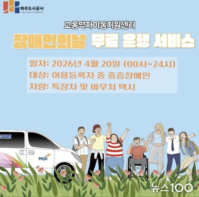 뉴스100 김동초 기자 | 파주도시공사 교통약자이동지원센터에서는 오는 4월 20일 장애인의 날을 맞아 교통약자를 위한 무료 운행 서비스를 실시한다.