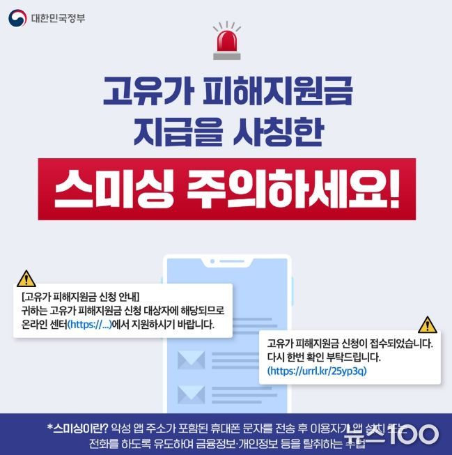 뉴스100 김동초 기자 | 안성시가 오는 27일부터 신청하는 ‘고유가 피해지원금’ 신청을 앞두고 정부 및 지자체 등을 사칭한 스미싱 등 금융 사기에 대해 시민들의 각별한 유의를 당부했다. 시는 특히 공식 알림 서비스인 ‘국민비서’를 적극 활용해 사기 피해를 예방할 것을 권고했다.
