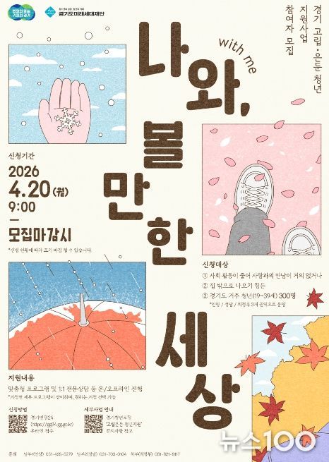 뉴스100 김동초 기자 | 경기도가 사회적 관계가 단절된 고립·은둔 청년의 일상 회복을 돕기 위해 20일부터 ‘경기 고립·은둔 청년 지원사업: 나와(with me), 볼만한 세상’ 참여자 300명을 모집한다.