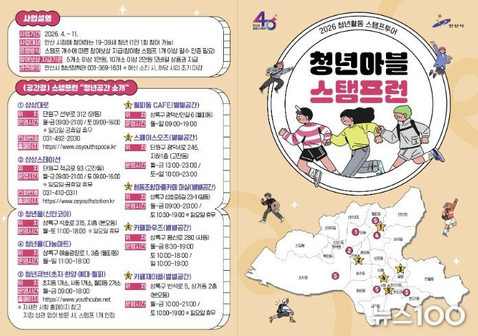 뉴스100 김동초 기자 | 안산시는 청년의 시정 참여를 확대하고 청년공간과 정책에 대한 접근성을 높이기 위해 청년활동 스탬프투어 ‘청년마블 스탬프런’ 사업을 운영한다고 20일 밝혔다.