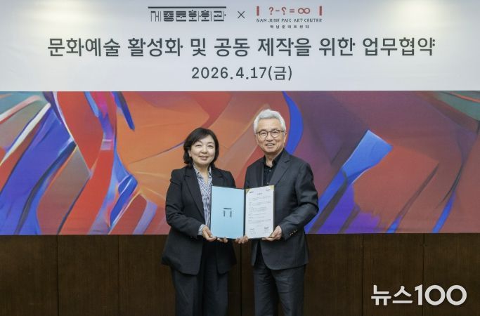 뉴스100 김동초 기자 | 경기문화재단 백남준아트센터와 재단법인 세종문화회관은 4월 17일, 동시대 예술의 담론 확장과 지속가능한 창작 생태계 조성을 위한 업무협약(MOU)을 체결했다. 이번 협약은 양 기관의 상호존중과 신뢰를 바탕으로, 서울과 경기 지역을 연결하는 광역 문화권 공동제작 모델을 구축하기 위한 협력의 출발점으로 마련됐다.