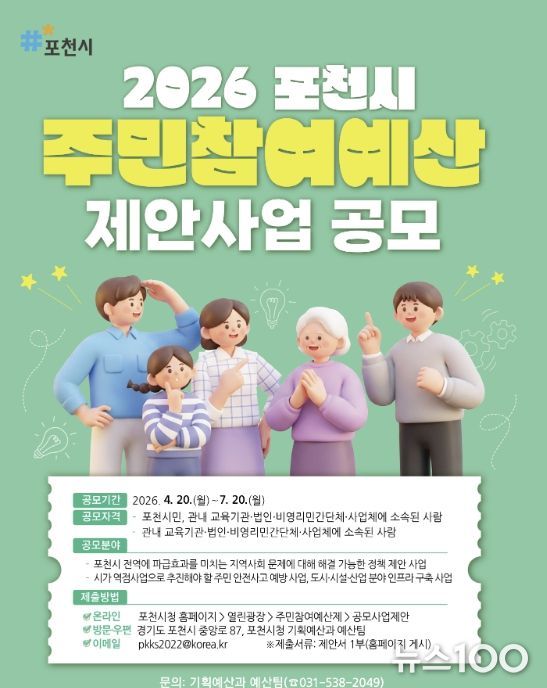 뉴스100 김동초 기자 | 포천시가 4월 20일부터 오는 7월 20일까지 2027년도 예산편성을 위한 주민참여예산 공모제안사업을 접수하고 있다.