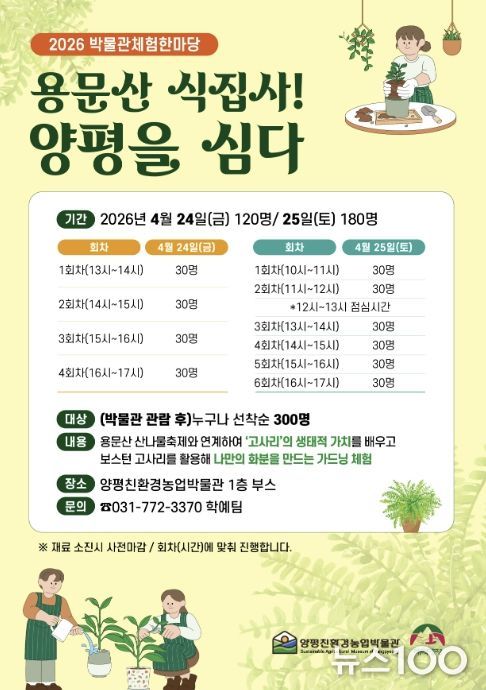 뉴스100 김동초 기자 | 양평친환경농업박물관은 오는 4월 24일부터 25일까지 이틀간 2026년 ‘박물관체험한마당’ 체험 프로그램을 운영한다.