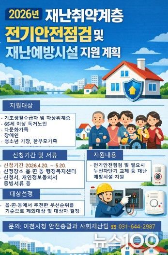 뉴스100 김동초 기자 | 이천시는 전기설비 노후화 등으로 인한 화재와 안전사고를 예방하고 재난취약계층의 주거 안전을 강화하기 위해 ‘재난취약계층 전기안전점검 및 재난예방시설 지원사업’을 추진한다고 밝혔다.