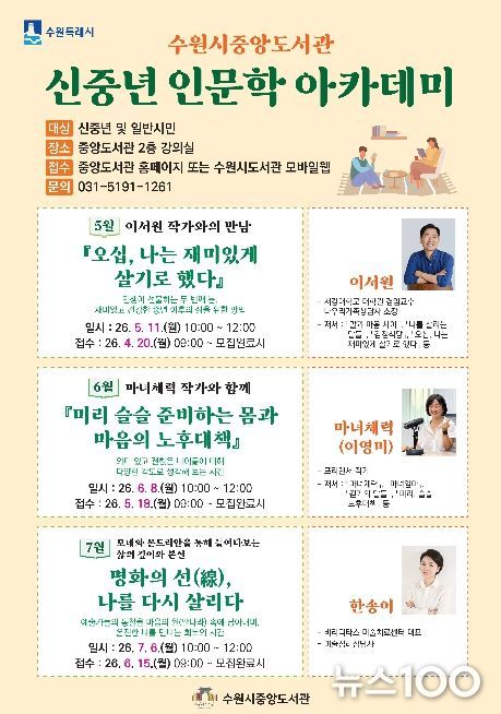 뉴스100 김동초 기자 | 수원시 중앙도서관이 5월부터 7월까지 매달 1회 운영하는 ‘신중년 인문학 아카데미’ 수강생을 모집한다.