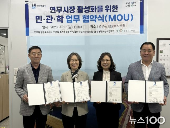 뉴스100 김동초 기자 | 수원시 장안구 연무동 행정복지센터와 주민자치회, 반딧불이연무시장상인회, 경기대학교 산학협력단은 지난 17일, 각 기관의 긴밀한 상호 협력과 유대관계 강화를 위한 업무협약을 체결했다.
