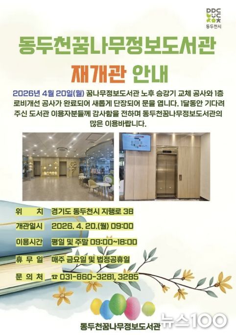 뉴스100 김동초 기자 | 동두천시 도서문화사업소 꿈나무정보도서관은 이용자 편의성과 안전성 강화를 위한 승강기 교체 공사와 1층 로비 환경개선 공사를 마치고 지난 4월 20일부터 재개관했다고 밝혔다.