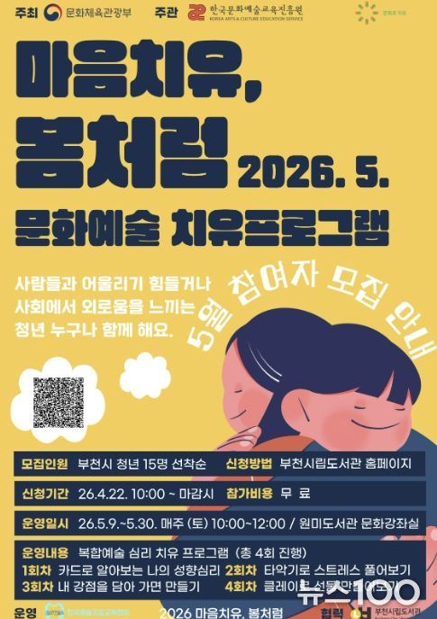 뉴스100 김동초 기자 | 부천시립원미도서관 청년공간 ‘원미청정구역’이 문화체육관광부 주최하고 한국문화예술교육진흥원이 주관하는 ‘2026 마음치유, 봄처럼’ 사업 협력기관으로 선정돼 청년 대상 문화예술 치유 프로그램을 운영한다고 21일 밝혔다.