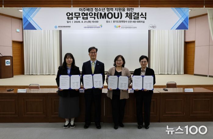 뉴스100 김동초 기자 | 경기도미래세대재단은 21일 수원시 팔달구 옛 경기도청사에서 수원시글로벌청소년드림센터, 안산시글로벌청소년센터, 화성시글로벌청소년센터와 이주배경 청소년 지원을 위한 업무협약을 체결했다.