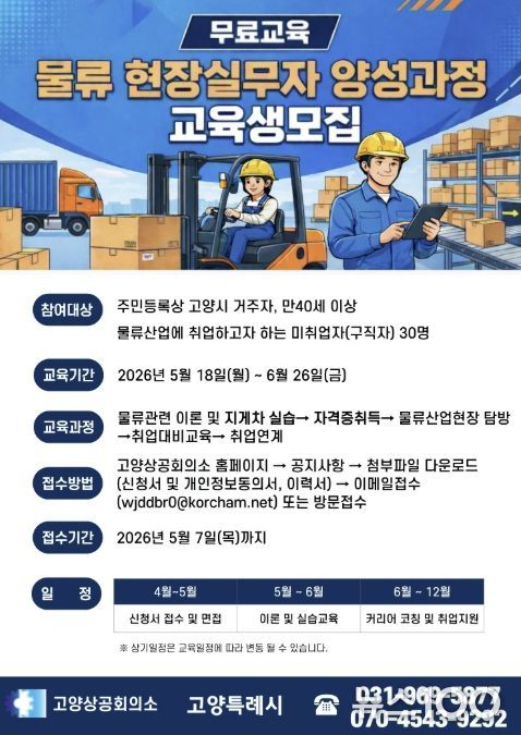 뉴스100 김동초 기자 | 고양특례시는 2026년 고양맞춤형 일자리학교 공모에 선정된 ‘물류 현장실무자 양성과정’에 참여할 교육생을 오는 5월 7일까지 모집한다.