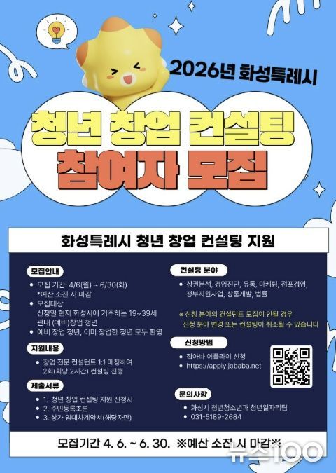 뉴스100 김동초 기자 | 화성특례시는 오는 6월 30일까지 ‘2026년 청년 창업 컨설팅 지원사업’ 참여자를 모집한다.