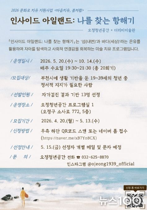 뉴스100 김동초 기자 | 부천시는 오정청년공간에서 정서적 고립감을 겪는 청년을 위한 미술 치유 프로그램 ‘인사이드 아일랜드: 나를 찾는 항해기’ 참여자를 5월 13일까지 모집한다.