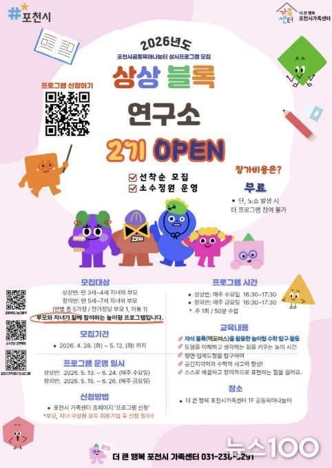 뉴스100 김동초 기자 | 포천시 직영 더 큰 행복 포천시가족센터가 공동육아나눔터 상시 프로그램 ‘상상블록연구소’ 2기 참여자 모집을 진행한다.