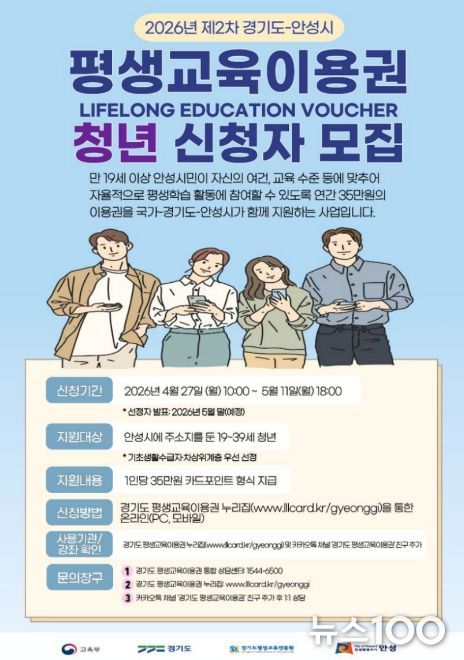 뉴스100 김동초 기자 | 안성시는 시민의 평생학습 참여 기회를 두텁게 보장하기 위해 오는 4월 27일 오전 10시부터 5월 11일 오후 6시까지 ‘2026년 제2차 경기도-안성시 평생교육이용권’ 지원 대상자를 모집한다고 밝혔다.