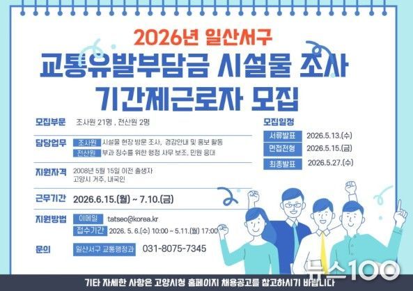 뉴스100 김동초 기자 | 고양특례시 일산서구는 ‘2026년 교통유발부담금 시설물 전수조사’ 실시를 위해 오는 5월 6일부터 보조원 23명을 모집한다.