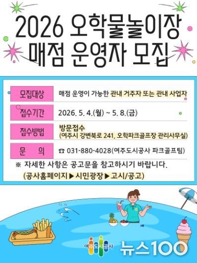 뉴스100 김동초 기자 | 여주도시공사는 2026년 오학물놀이장 운영을 앞두고 이용객 편의 제공을 위한 매점 운영자를 공개 모집한다고 밝혔다.