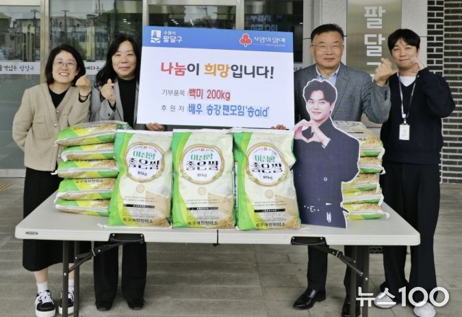 뉴스100 김동초 기자 | 수원시 팔달구은 배우 송강 팬모임 ‘송aid’로부터 송강 배우의 생일(4월 23일)을 기념한 사랑의 백미 200kg을 전달받아 관내 취약계층 지원에 나선다고 밝혔다.