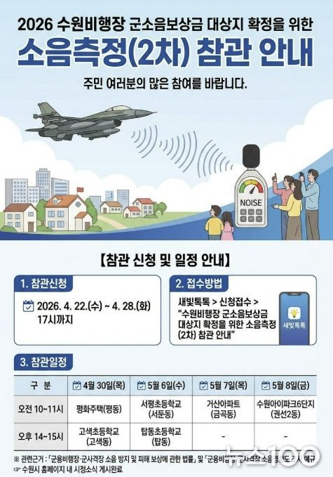 뉴스100 김동초 기자 | 수원특례시가 수원비행장 인근 주민들의 소음 피해 보상 근거가 될 국방부의 ‘수원비행장 소음 영향도 조사 2차 소음측정’ 주민 참관 참여자를 모집한다. 4월 28일까지 새빛톡톡으로 신청할 수 있다.