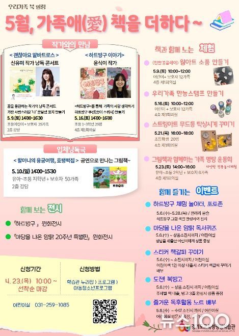 뉴스100 김동초 기자 | 경기도교육청평생학습관이 가족 사랑 실천과 가족 간 유대감 증진을 위해 가족 독서체험 행사인 䃵월, 가족애(愛) 책을 더하다’를 운영한다.