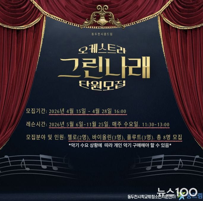 뉴스100 김동초 기자 | 동두천시학교밖청소년지원센터는 2026년을 맞아 학교 밖 청소년을 대상으로 ‘그린나래 오케스트라’ 신규 단원을 모집한다고 밝혔다.