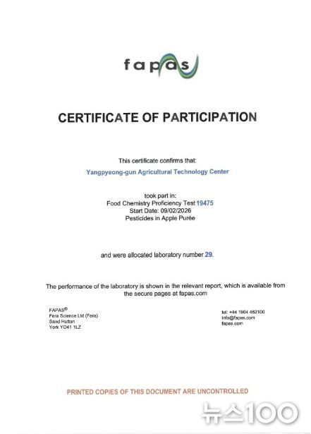 뉴스100 김동초 기자 | 양평군은 영국 식품환경연구청(FERA)이 주관한 ‘2026년 잔류농약 국제비교숙련도 평가’에서 최고 수준의 분석능력을 인정받아 3년 연속 우수성을 입증했다고 21일 밝혔다.