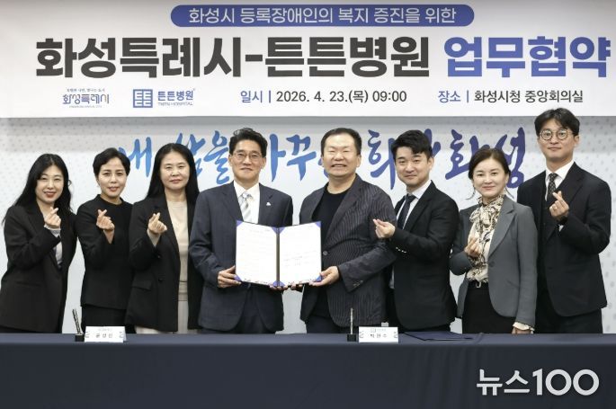뉴스100 김동초 기자 | 화성특례시는 23일 본관 2층 중앙회의실에서 튼튼병원과 화성시 등록장애인의 건강한 생활 지원과 삶의 질 향상을 위한 업무협약을 체결했다.