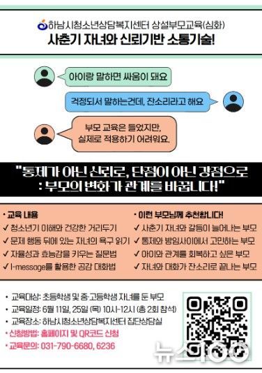 뉴스100 김동초 기자 | 하남시 청소년상담 복지센터가 부모와 자녀 간 소통을 돕기 위한 부모교육 프로그램을 한층 강화한다. 특히 청소년기 자녀와의 대화에 어려움을 느끼는 부모들이 실제로 체감할 수 있는 교육으로 개편한 것이 특징이다.