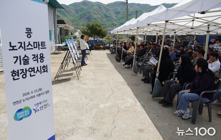 뉴스100 김동초 기자 | 경기도농업기술원은 23일 연천군 연천읍 옥산리 일원에서 ‘콩 노지스마트 기술 적용 현장 연시회’를 열고, 최근 주목받고 있는 노지 스마트농업 기술을 선보였다.