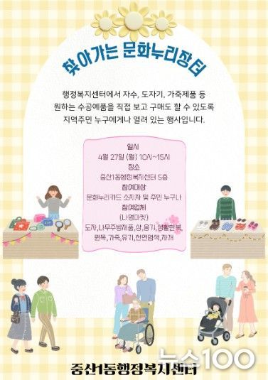 뉴스100 김동초 기자 | 고양특례시 일산동구 중산1동은 오는 4월 27일 오전 10시부터 오후 3시까지 센터 5층 다목적실에서 ‘찾아가는 문화누리장터’를 개최한다.