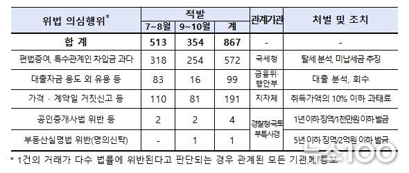 이번 기획조사는 대출규제 강화, 토지거래허가구역 확대 등 시장 안정화 대책이 본격적으로 실행됨에 따라, 편법 대출·증여나 토지거래허가 위반 등 시장질서를 교란하는 이상거래가 확대될 우려에 대비하여 서울 및 경기 일부지역(6곳)에 한정했던 ’25.1월~6월 조사와 달리 해당 지역 외에 경기 9곳을 추가 확대하여 ‘25.7월 ~ 10월 거래 신고분에 대해 실시했으며,이상거래 총 2,255건을 조사하여 위법 의심거래 746건(위법의심행위 867건)을 적발했다.