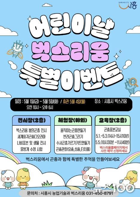 뉴스100 김동초 기자 | 시흥시 곤충체험전시관 ‘벅스리움’은 어린이날을 맞아 아동과 가족이 함께 즐길 수 있는 ‘특별 프로그램’을 오는 5월 1일부터 5일까지 운영한다.