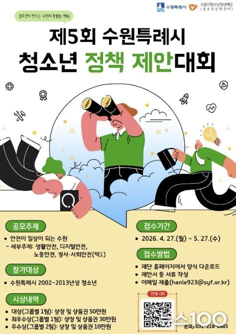 뉴스100 김동초 기자 | 수원시청소년청년재단 수원청소년문화센터는 청소년이 정책을 기획하고 제안하는 ‘제5회 수원특례시 청소년 정책 제안대회’ 참가팀을 4월 27일부터 5월 27일까지 모집한다.