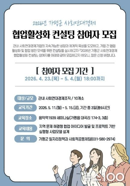 뉴스100 김동초 기자 | 가평군이 사회연대경제 조직 간 협업 활성화를 위해 ‘2026년 사회연대경제 협업활성화 컨설팅’을 추진하고, 참여 조직을 5월 4일까지 모집한다.
