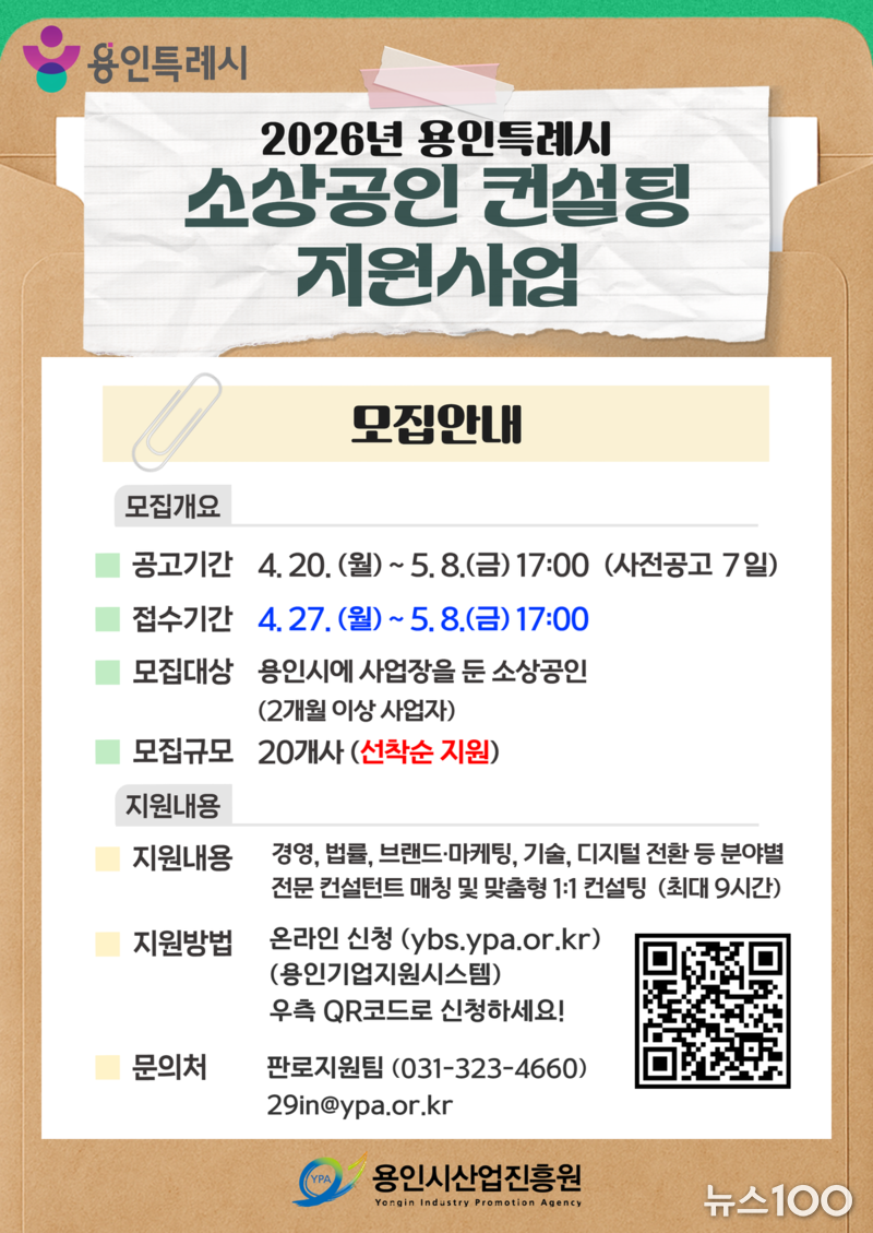 신청은 27일부터 5월 8일까지 용인기업지원시스템 누리집(ybs.ypa.or.kr)에서 온라인으로 진행한다.
