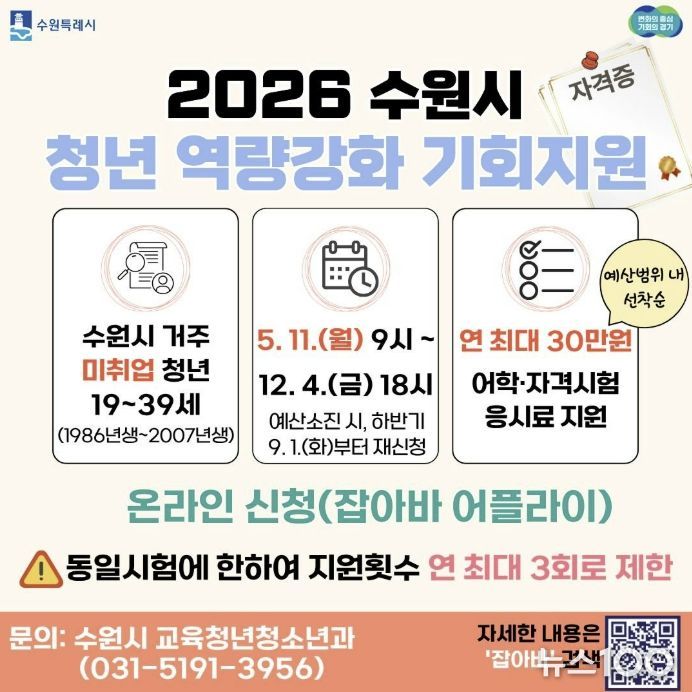 뉴스100 김동초 기자 | 수원특례시는 미취업 청년의 취업 준비 비용 부담을 덜어주는 ‘청년 역량강화 기회 지원 사업’을 12월 4일까지 운영한다. 미취업 청년에게 어학·자격시험 응시료를 1인당 연 최대 30만 원 지원한다.