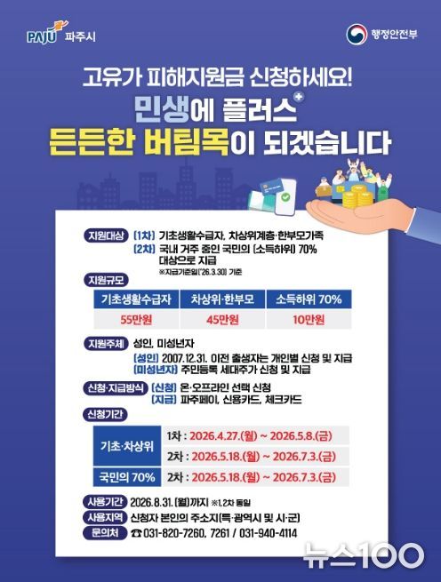 뉴스100 김동초 기자 | 파주시는 오늘(27일)부터 시민 생활 안정을 위한 정부 추진 ‘고유가 피해지원금’1차 신청을 받는다. 이번 1차 신청 대상은 기초생활수급자, 차상위계층, 한부모가구이며, 신청 기간은 4월 27일부터 5월 8일까지다.