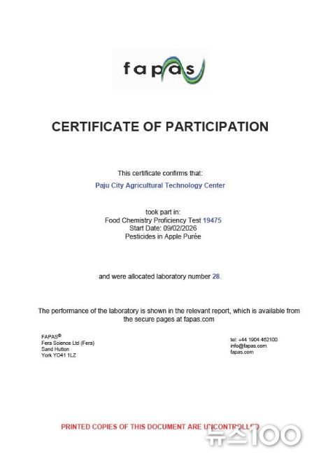 뉴스100 김동초 기자 | 파주시 농산물 안전분석실이 국제적으로 공신력 있는 잔류농약 분석 능력 평가에서 4년 연속 우수한 결과를 달성하며 세계 수준의 분석 역량을 입증했다.