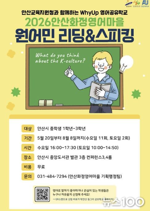 뉴스100 김동초 기자 | 안산시가 설립하고 안산대학교가 운영하는 안산화정영어마을은 경기도안산교육지원청과 협력해 관내 중학생을 대상으로 ‘제2회 원어민 리딩·스피킹 프로그램’을 운영하고 참가자를 모집한다고 27일 밝혔다.