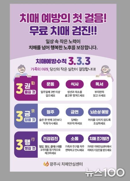 뉴스100 김동초 기자 | 광주시치매안심센터는 치매 발병 위험이 높은 고령층을 집중 관리하기 위해 오는 29일부터 30일까지 광주시 스포츠헬스센터에서 ‘치매 조기 검진 및 인식 개선 캠페인’을 실시한다고 27일 밝혔다.