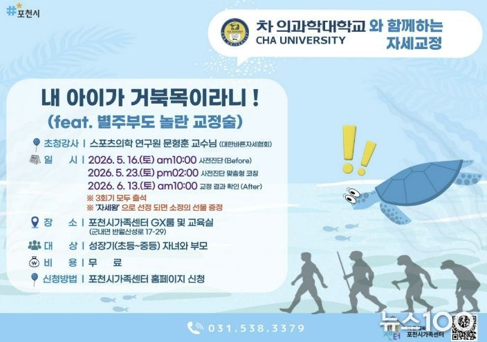 뉴스100 김동초 기자 | 포천시 더 큰 행복 포천시가족센터는 오는 5월 16일부터 6월 13일까지 성장기 자녀를 둔 가족을 대상으로 부모역할지원사업 ‘내 아이가 거북목이라니! feat.별주부도 놀란 교정술’ 프로그램을 운영한다.